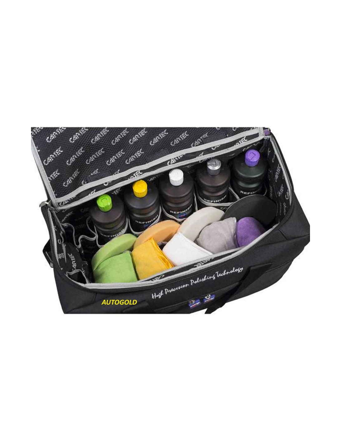 Il borsone Cartec ha scomparti interne in cui riporre 5 flaconi da 1 Lt, pads e panni ed ulteriori tasche esterne che permettono di riporre piccoli accessori.