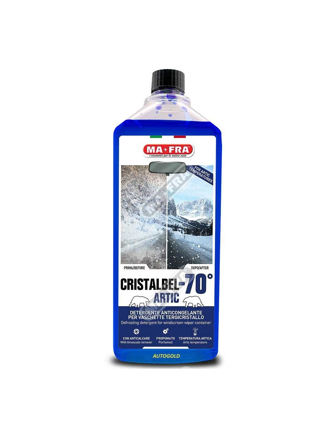 Cristalbel Artic -70 è un liquido detergente concentrato profumato anticongelante per vaschette tergicristallo, ideale per l’inverno e le basse temperature.